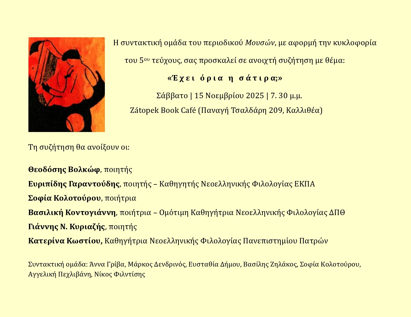 Στις 15 Νοεμβρίου οι Λογοδιαδρομές προσκλήθηκαν στην εκδήλωση του περιοδικού Μούσες με αφορμή την κυκλοφορία του πέμπτου τεύχους και θέμα «Έχει όρια η σάτιρα;».